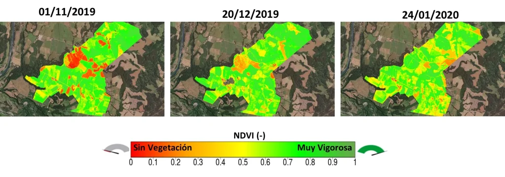 Por otra parte, las aplicaciones de Sentinel-2 y 3 también han tenido un impacto notorio en las aplicaciones medio ambientales y agrícolas. Hoy es muy común visualizar el índice de vigor, comúnmente llamado NDVI por su sigla en inglés (Normalized Difference Vegetation Index). Adicionalmente, también se suman otros índices de vegetación que resaltan el éxito de plantación de una cosecha, el riesgo fitosanitario, índices que permiten distinguir nieve de glaciar, humedad del suelo, cuerpos de agua, o también como insumos de modelos donde se aplican técnicas de inteligencia artificial para determinar cambios en la cobertura. La mayor parte de estos índices se pueden disponer de forma gratuita desde el 2015 generando análisis de series de tiempo en el manejo en cultivos o los cambios en el paisaje ya sean por causas antrópicas o naturales.