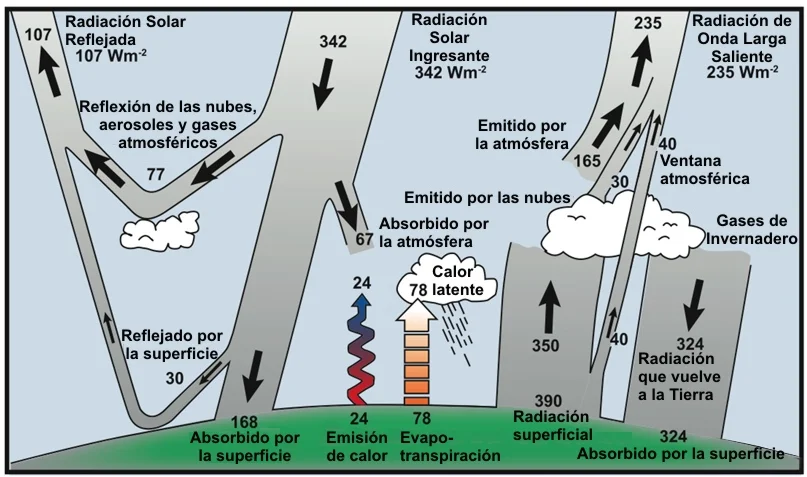 En un balance global, la radiación incidente total que alcanza la superficie de la tierra se denomina Radiación solar (Rs), la cual normalmente equivale a un 50% de la energía que llega al tope de la atmósfera. El resultado de este balance de ganancias y pérdidas de energía desde y hacia la superficie, se denomina Radiación Neta.
